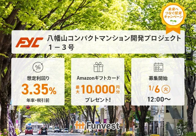 貸付型クラウドファンディングサービス「Funvest(ファンベスト)」が、2026年1月6日より新たなファンド、「FYC 八幡山コンパクトマンション開発プロジェクト1-3号」の募集を開始します。このプロジェクトは、投資家からの出資金を株式会社FYCに貸付け、販売用不動産の土地購入に使用します。