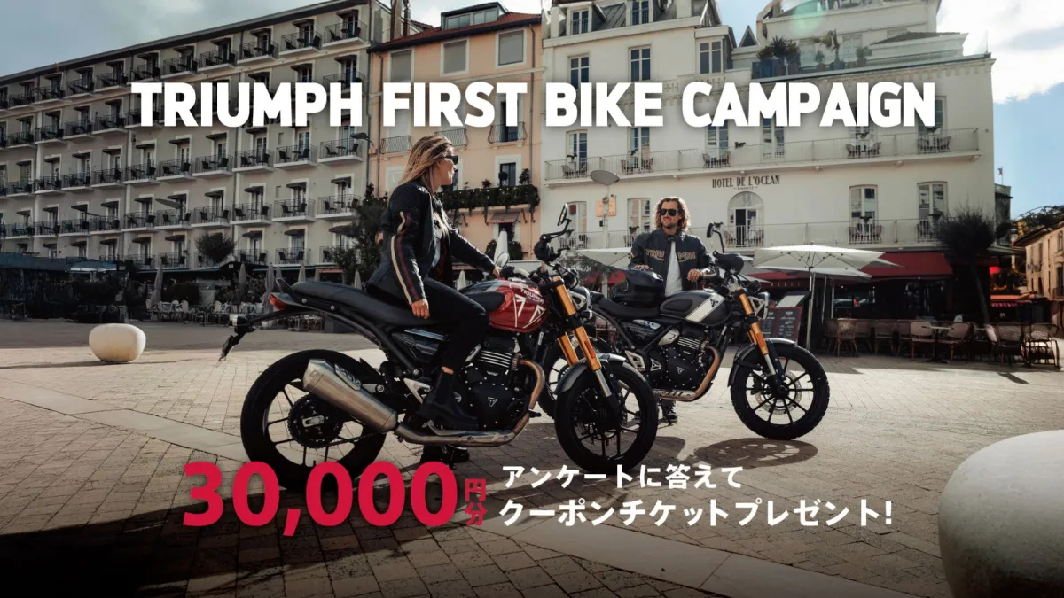 トライアンフモーターサイクルズジャパン株式会社は、2023年10月8日から2023年12月26日までの期間に「FIRST BIKE Campaign」を開催します。このキャンペーンは、普通自動二輪免許を6ヶ月以内に取得したばかりのライダーを対象としており、嬉しい特典が用意されています。