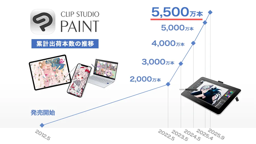 セルシスの「CLIP STUDIO PAINT」は、イラストやマンガ、Webtoon、アニメーション制作に特化したアプリケーションで、2025年9月には全世界での出荷本数が5500万本を超えました。この成果は、イラストを描くクリエイターたちの努力と、同アプリの完成度の高さを示しています。
