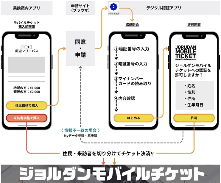 今回開発されたモバイルチケット機能は、利用者の属性を確認し、多様なチケットの価格設定を可能にします。具体的には、利用者が提供する情報と公的個人認証サービス(JPKI)を組み合わせ、正確な属性区分を確認します。このシステムにより、住民には生活支援型の料金を、観光客には多様な周遊パスを提供することが実現します。