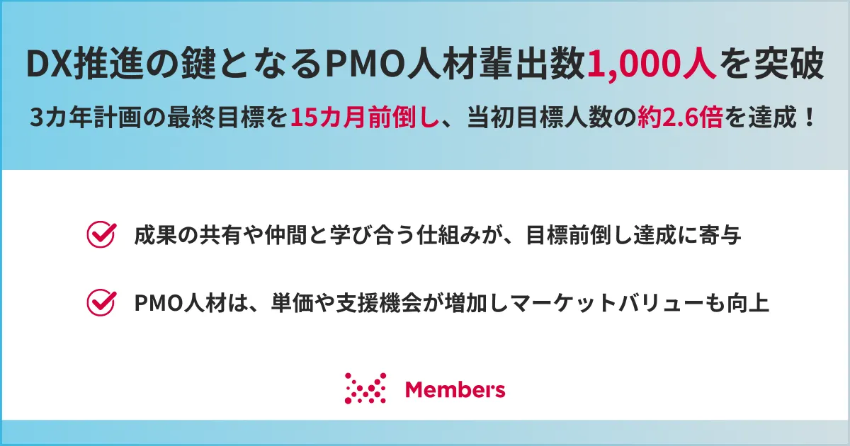 株式会社メンバーズ(以下メンバーズ)は、2024年5月に企業のデジタルトランスフォーメーション(DX)推進を目的としたプロジェクトマネジメント支援の一環として、PMO(プロジェクト・マネジメント・オフィス)人材の育成を開始しました。目標として掲げた1,000人の輩出数が、2025年12月時点で達成され、さらにその数は当初目標の約2.6倍に達しました。この成功事例は、DX人材の需給ギャップが叫ばれるなかでの重要な成果と言えるでしょう。