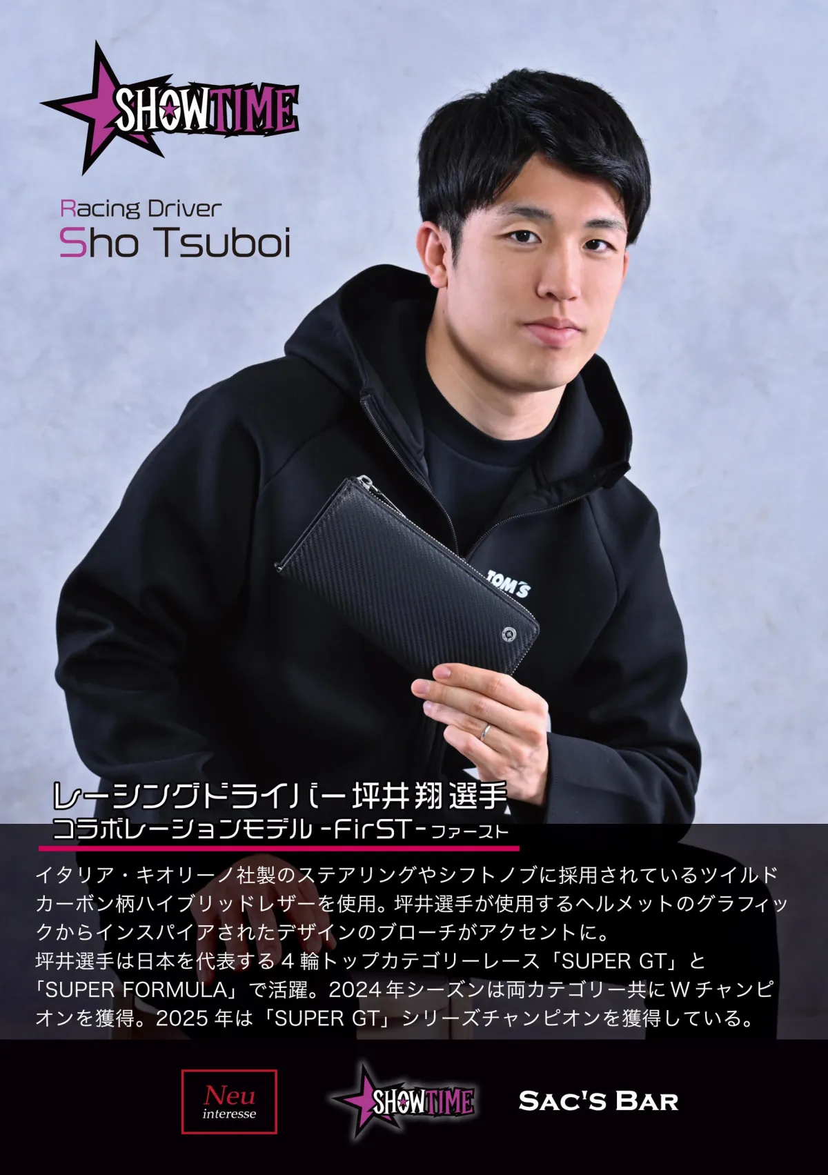 新たに登場する「FirST -ファースト-」シリーズは、坪井選手が実際に使用しているヘルメットからインスパイアを受けたデザインが特徴です。ヘルメットには「SHOWTIME」のロゴと坪井選手のイニシャル「ST」があしらわれ、レースの緊張感を巧みに表現しています。また、商品にはツイルドカーボン柄ハイブリッドレザーが使用されており、耐久性と実用性を兼ね備えています。この素材はモータースポーツで求められる精度や美しさを反映しており、使いやすさを追求したアイテムに仕上がっています。