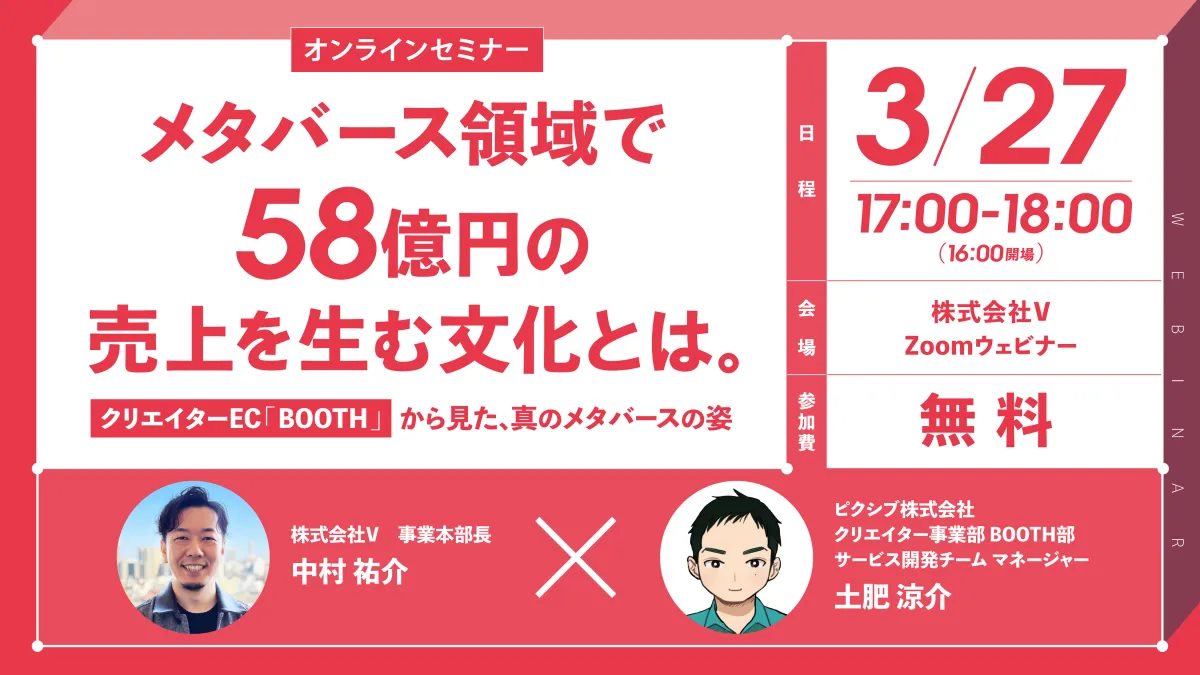 2025年3月27日、株式会社Vはメタバースに特化したオンラインセミナーを開催する。このセミナーでは、「メタバース領域で58億円の売上を生む文化とは。クリエイターEC「BOOTH」から見た、真のメタバースの姿」と題し、ピクシブ株式会社の土肥涼介様をゲストに迎える。