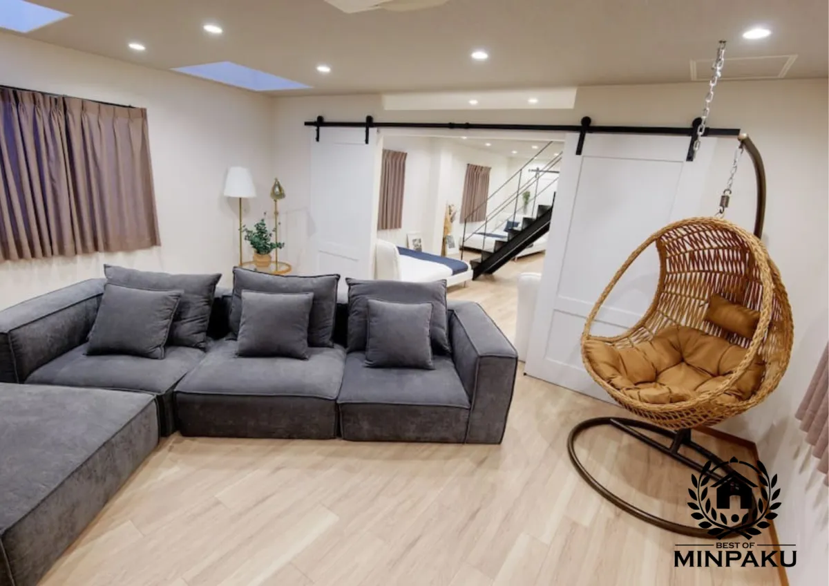 この民泊の特徴は、なんといってもその広さ。お部屋は230㎡を誇り、最大22名まで宿泊可能なメゾネットタイプです。大人数での滞在を希望する家族やグループにとって、非常に魅力的な選択肢です。また、屋上バルコニーではBBQを楽しむことができ、夜空の下でお酒を楽しむことも可能です。特に女性には嬉しいKINUJOドライヤーをはじめとするアメニティが充実しています。