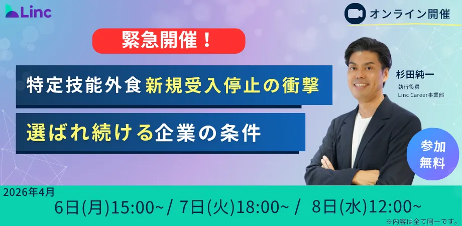 2026年3月27日、出入国在留管理庁は、外食業分野での特定技能1号の在留者数が上限の5万人に近づいていることを発表しました。この発表により、4月13日以降、新たな受入れが原則として停止される見通しとなっています。これに危機感を抱いた株式会社Lincは、外食事業者を対象に緊急のオンラインセミナーを開催します。セミナーは2026年4月の初めに行われる予定で、参加は無料です。