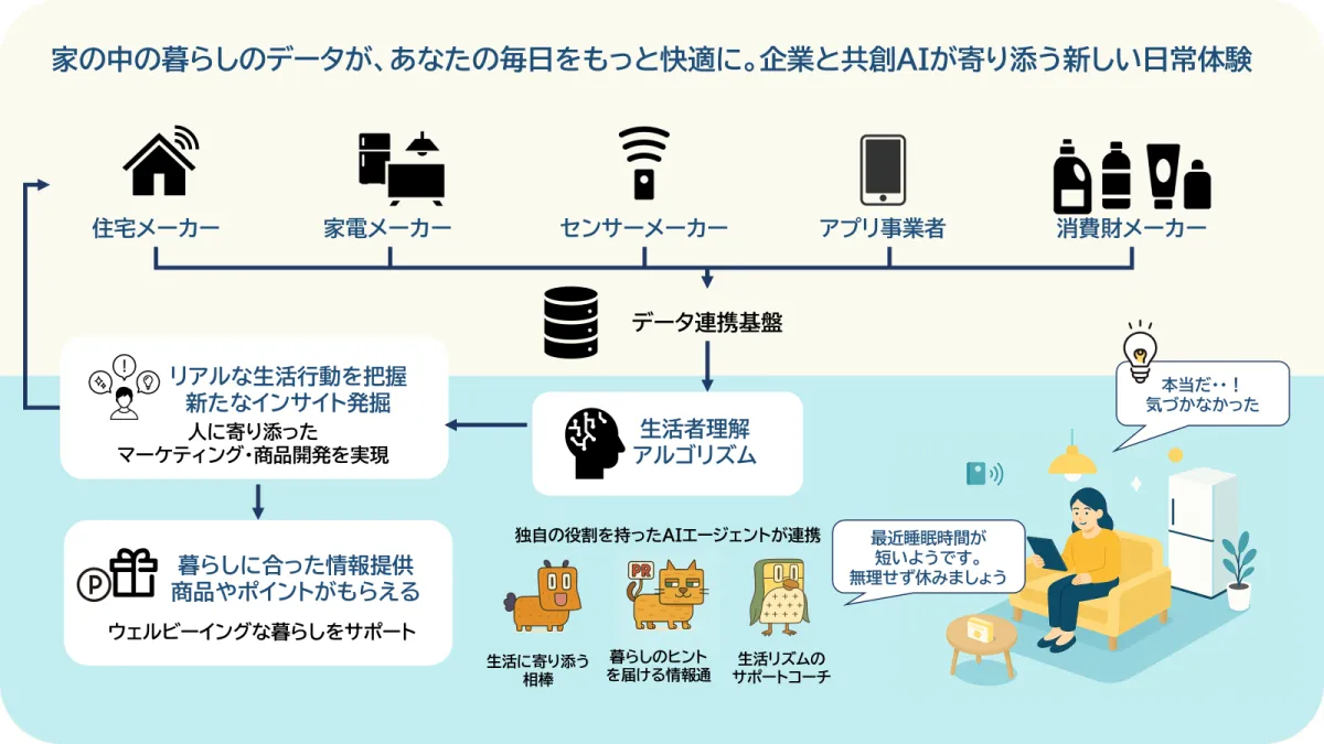 このプロジェクトの期間は2025年6月から12月までを予定しています。対象となるのは、「HAUS UPDATA」のモニターに参加した100世帯以上です。具体的には、IoTデバイスを設置し、参加企業が提供する商品を家庭に配布した上で、収集したデータをAIに分析させ、個々に合った生活提案を行います。このようにして、収集されたデータは企業のマーケティング施策にも活用されるという仕組みです。