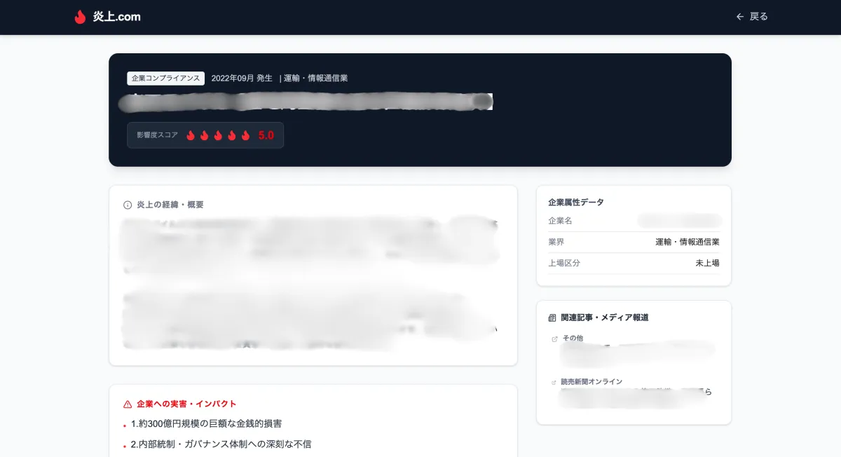 「炎上.com」では、各事例に対し影響度スコアが付与されます。スコアは1(限定的)から5(致命的)まであり、それに応じた事例の深刻度を把握できます。実際の炎上事例を持ち寄って、企業は自社に潜むリスクを新たに認識し、対策を講じることができるでしょう。