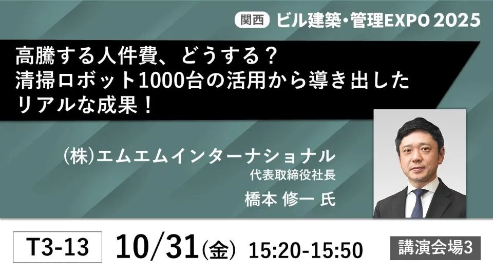 2025年10月30日と31日の二日間にわたり、インテックス大阪で開催される「住まい・建築・不動産の総合展[BREX関西]」にて、株式会社エムエムインターナショナル(MMI)の代表取締役社長、橋本修一氏が特別セミナーに登壇します。本セミナーでは、高騰する人件費や深刻な人手不足という現状を踏まえ、「高騰する人件費、どうする? 清掃ロボット1000台の活用から導き出したリアルな成果」と題した講演が行われる予定です。