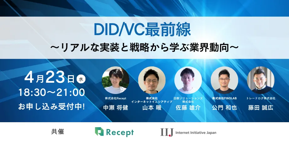 2025年4月23日(水)、東京・八重洲にてデジタルアイデンティティおよびVCに焦点を当てた特別イベントが開催されます。このイベントは、株式会社Receptと株式会社インターネットイニシアティブの共催によるもので、業界の専門家が一堂に会し、実際の開発事例や最新の技術についての情報交換を行います。