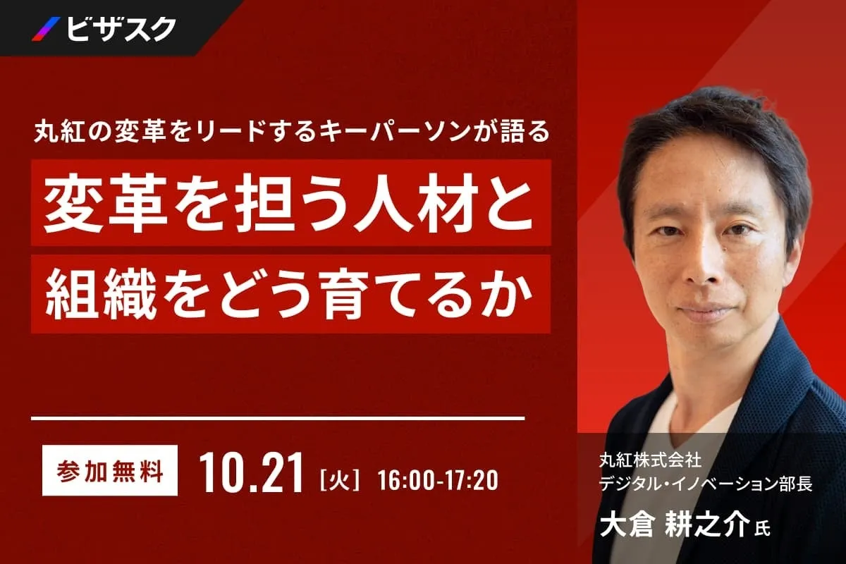 株式会社ビザスクは、10月21日(火)16:00より、丸紅株式会社のデジタル・イノベーション部長である大倉耕之介氏をゲストに迎え、無料のオンラインセミナーを開催します。このセミナーでは、現代の企業が直面する変革の重要性とそれに必要な人材、組織の育成について焦点を当てます。