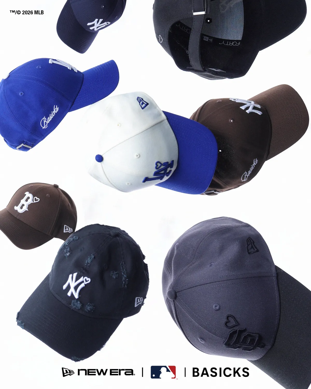 今回のコレクションは、ニューエラ公式オンラインストア、BASICKS直営店、及び全国のBASICKS取扱店にて入手可能です。これまでにもさまざまなMLB企画を展開してきたニューエラですが、ボストン・レッドソックスとサンフランシスコ・ジャイアンツをフィーチャーした作は、これが初の試みとなります。特別なデザインは、フロントに各チームのロゴをあしらい、さらにBASICKSオリジナルのハートマークを添えており、非常にキャッチーです。
