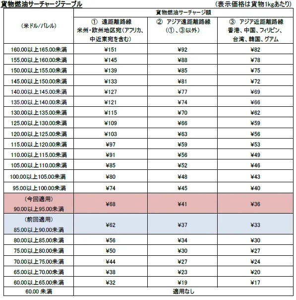燃油サーチャージは、航空貨物を輸送する際の燃料費用の変動を反映させるために導入されています。JALは、2025年1月のジェット燃料の平均価格が1バレル当たり93.98米ドルというデータに基づき、燃油指標価格を「90.00以上95.00未満」としました。これにより、以下のようなサーチャージ額が設定されています。