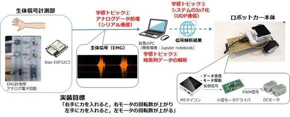 このシステムは、Pythonというプログラミング言語を使用して実装されています。学生たちは、自らの生体信号を計測・解析し、その結果をWiFiを通じてロボットカーに送信するプログラムを作成します。この過程を通じて、学生はプログラミングだけでなく、電子回路、マイコン、生体信号、さらには通信技術など広範な分野に触れることができます。これにより、理論だけでなく実践的な「ものづくり」の技術を習得できることが、この講義の最大の特徴です。