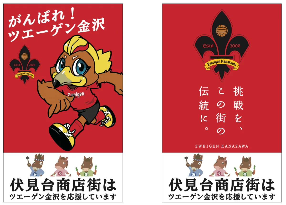 ツエーゲン金沢は地域密着型のクラブとして知られ、サポーターや地域住民とのつながりを大切にしています。このたび、伏見台商店街にタペストリーを掲出することで、より多くの人々に地元の魅力を伝えることが目的です。このタペストリーは、商店街のマスコットキャラクター「みんま三兄弟」のイラストをあしらったデザインで、地域に愛される存在を目指しています。