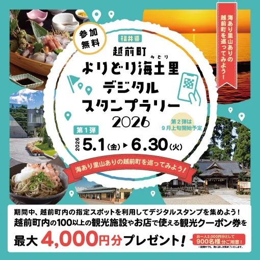福井県越前町では、2026年5月1日から6月30日まで、一般社団法人越前町観光連盟の主催による『越前町よりどり海土里デジタルスタンプラリー』が実施されます。このイベントは、越前町の魅力を再発見し、多くの観光客に楽しんでもらうことを目的としています。