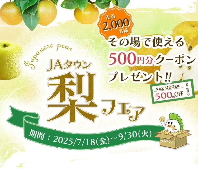 - - 内容:先着2,000名にJAタウンでの梨購入時に使える500円クーポンをプレゼント。