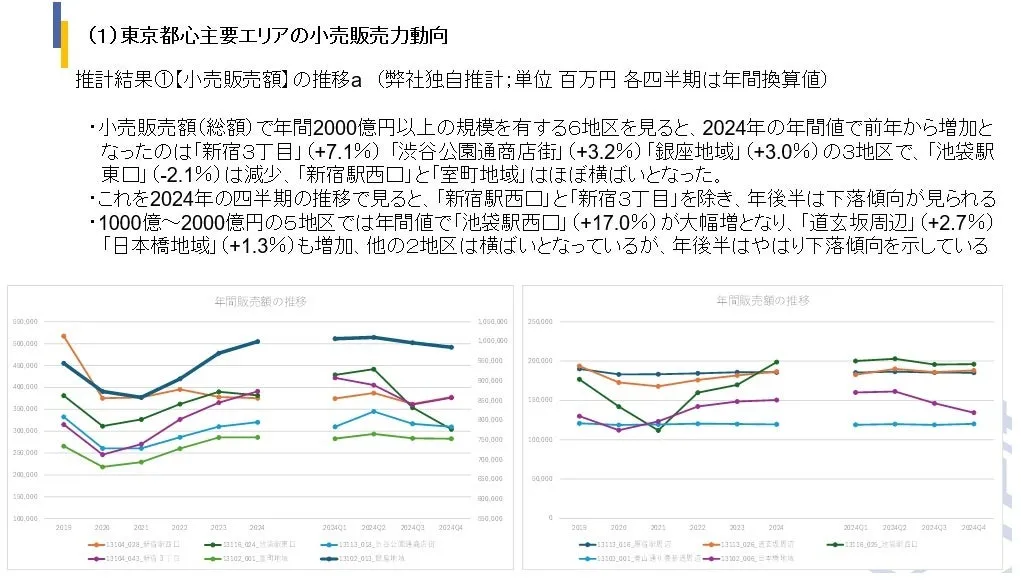 今回の分析で選ばれたエリアは、東京都の都心主要6区(千代田区、中央区、港区、新宿区、渋谷区、豊島区)に位置する商業集積地区です。具体的には、以下の5つのエリアが注目されています: