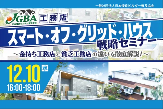 2025年12月10日(水)に開催予定の「スマート・オフ・グリッド・ハウス戦略セミナー」は、一般社団法人日本優良ビルダー普及協会(JGBA)による特別な学びの場です。このイベントは工務店やリフォーム会社を対象に、近未来の住宅に関する重要な情報を提供します。
