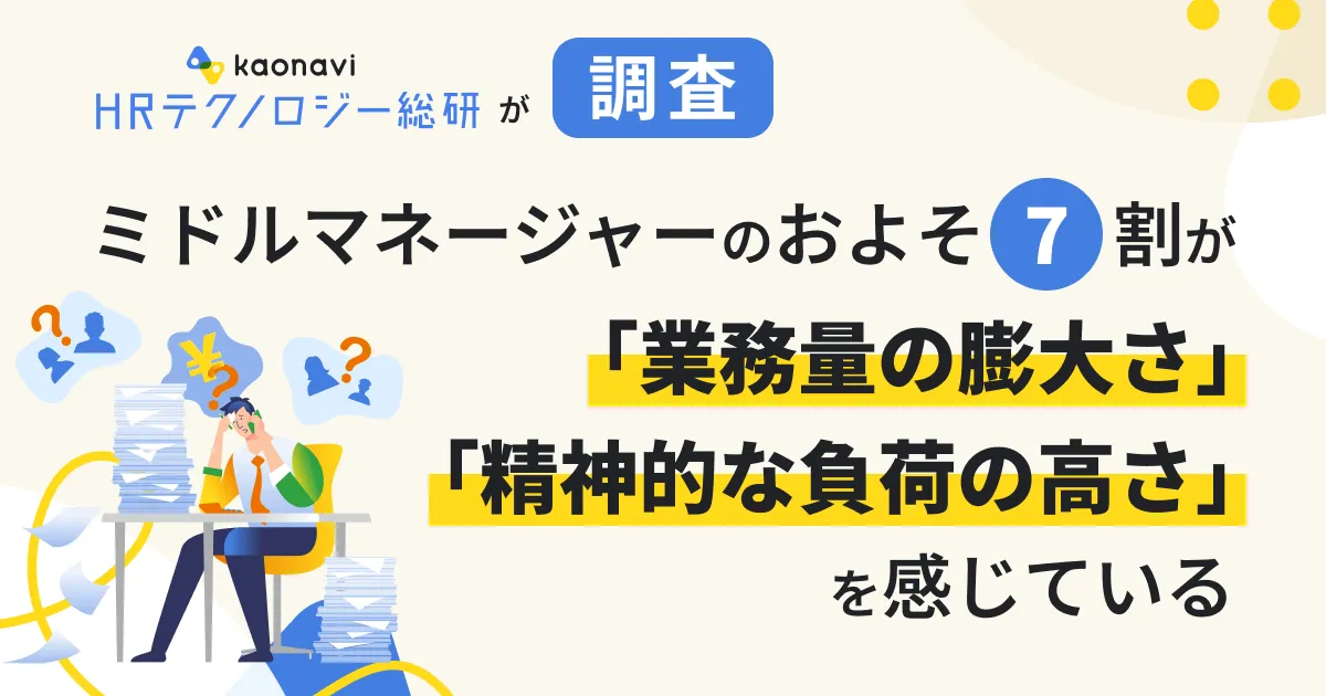 最近発表されたカオナビの調査結果によると、約7割のミドルマネージャーが業務過多と精神的な負荷を強く実感していることが明らかになりました。この調査は、企業組織におけるミドルマネージャーの役割や育成に関する重要な知見を提供しています。