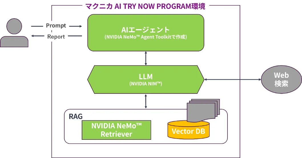 AI TRY NOW PROGRAMにより、企業はさまざまなユースケースを試すことができます。例えば、NVIDIA NeMo Agent Toolkitを利用してAIエージェントを構築し、API経由でプロンプトを送り、AIエージェントからのレポートを受け取ることができます。また、業務効率化を目的としたAIエージェントの検証は、実際に行われており、その結果をもとに実際に導入する際の判断をサポートします。