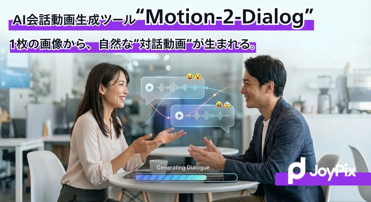 合同会社JoyPixが新たに発表した「Motion-2-Dialog」は、静止画から高品質な対話動画を生成する革新的な機能です。この新機能は、2025年12月18日(木)より正式にリリースされます。AIによるコンテンツ制作ツール「JoyPix.AI」を運営する同社は、この機能を通じて、よりリアルな会話シーンを表現することを目的としています。