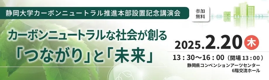 この新しい取り組みの一環として、静岡大学は2025年2月20日(木曜日)に「カーボンニュートラルな社会が創る「つながり」と「未来」」をテーマにした記念講演会を開催します。このイベントは、静岡県コンベンションアーツセンター6階交流ホールで行われ、午後1時30分から午後4時まで行います。参加費は無料ですが、事前申し込みが必要で、定員は200名となっています。参加希望者は、指定されたQRコードまたはURLを使って、2025年2月10日(月曜日)までに申込みを行う必要があります。