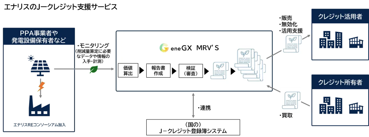 この新サービスの最大の目的は、企業が持つ環境価値を顕在化させ、J-クレジットに変換する手助けをすることにあります。通常、J-クレジットを創出するためには、プロジェクトの登録から始まり、モニタリングや報告書の作成といった煩雑な手続きが必要です。しかし、エナリス独自のシステムを活用することで、これらの手続きを簡略化し、出発点であるPVの自家消費がそのままJ-クレジットとして認識される道筋を作ります。