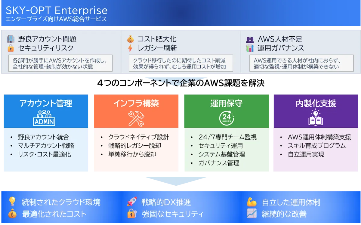 株式会社スカイアーチネットワークスは、2001年に設立され、AWSの先進パートナーとして多岐にわたるサービスを提供しています。10,000件以上のプロジェクト実績を誇り、クラウド構築や運用代行にとどまらず、セキュリティ対策や内製化支援、AI活用など、幅広いサポートを行っています。エンタープライズ向けクラウド運用サービス「SKY-OPT Enterprise」は、その多様なニーズに応えるべく設計されています。