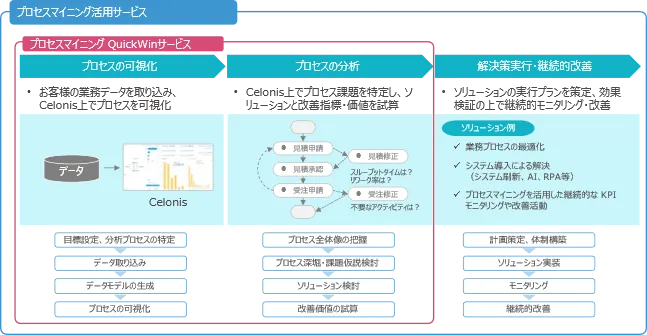 今回最初に提供される「プロセスマイニングQuickWinサービス」では、企業の特定業務データを利用して業務プロセスを可視化し、改善点を特定、さらには効果試算まで行います。このサービスは短期間での導入が可能で、わずか2〜3ヶ月で具体的な効果を実感できることを目指しています。