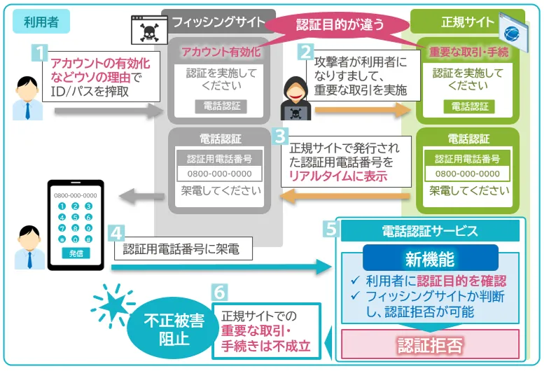 インテックはこれらの問題を受けて、電話認証サービスに新機能を追加しました。この機能では、利用者が電話で認証を行う際に確認が行われ、認証目的を把握することでフィッシングの危険性を認識させ、不正アクセスを防ぐことができるのです。特に注目すべきは、認証を促すフィッシングサイトと正規サイトでの認証が異なる点に着目したことです。これにより、利用者は巧妙に仕掛けられた罠に気付けるようになります。