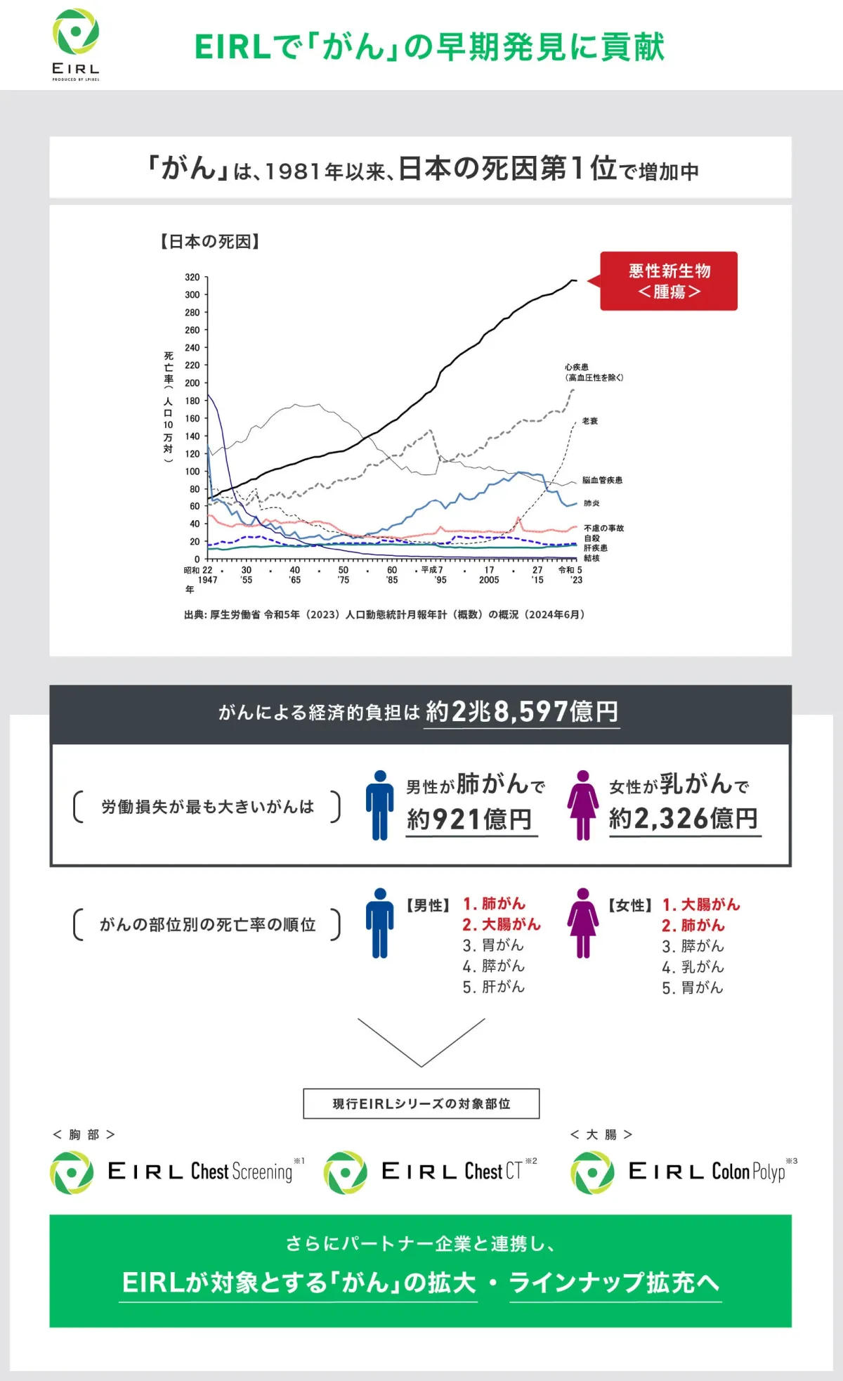 エルピクセルは、「医療AIですべての人に健康な未来を」という理念のもと、画像診断支援AI「EIRL」シリーズを展開し、これまでに900以上の施設に導入実績を持つ企業です。がんは早期発見が極めて重要な疾患であり、画像診断支援AIはそのリスクを大幅に減少させることが期待されています。