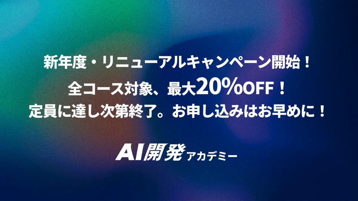 昨今、生成AI技術が急速に発展し、AIを活用したサービス開発がますます重要視されています。このような時代背景において、AI開発スキルを身に付けたい方にとって、今は絶好のチャンスです。特に、AI開発アカデミーが新年度に向けて実施しているリニューアルキャンペーンは、多くの受講生にとって見逃せない内容となっています。