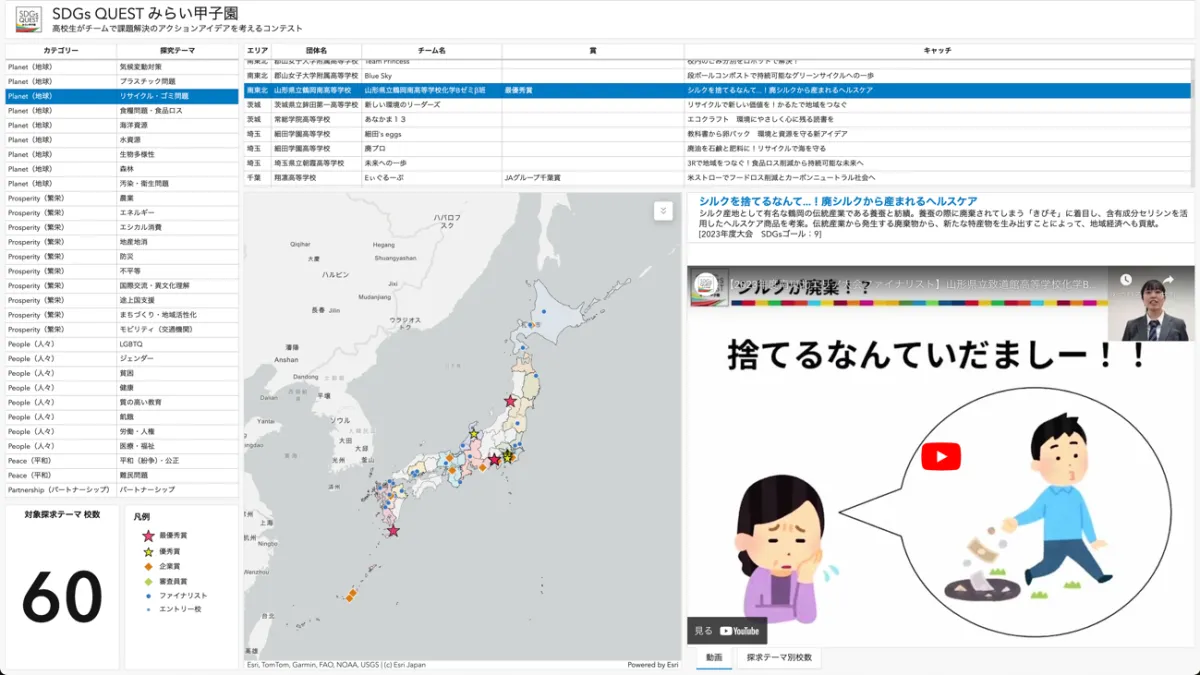「みらい甲子園GISプラットフォーム」は、ESRIジャパンが提供する地理情報システム「ArcGIS」を基に構築されています。これにより、全国各地で実施される高校生のSDGs活動を地域別・テーマ別に視覚化し、教育研究や探究学習に役立てることができます。
