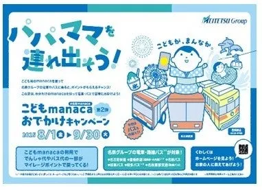名鉄グループが展開する「こどもmanacaおでかけキャンペーン第2弾」が、2025年の夏に開催されることが発表されました。このキャンペーンは、小児用のmanacaカードを利用して交通機関を利用することで、運賃の一部をマイレージポイントとして還元する仕組みです。対象となるのは名古屋鉄道、豊橋鉄道、名鉄バスなど、名鉄グループの関連会社が運行する公共交通機関で、子どもたちの交通機関への親しみを促すことを目的としています。