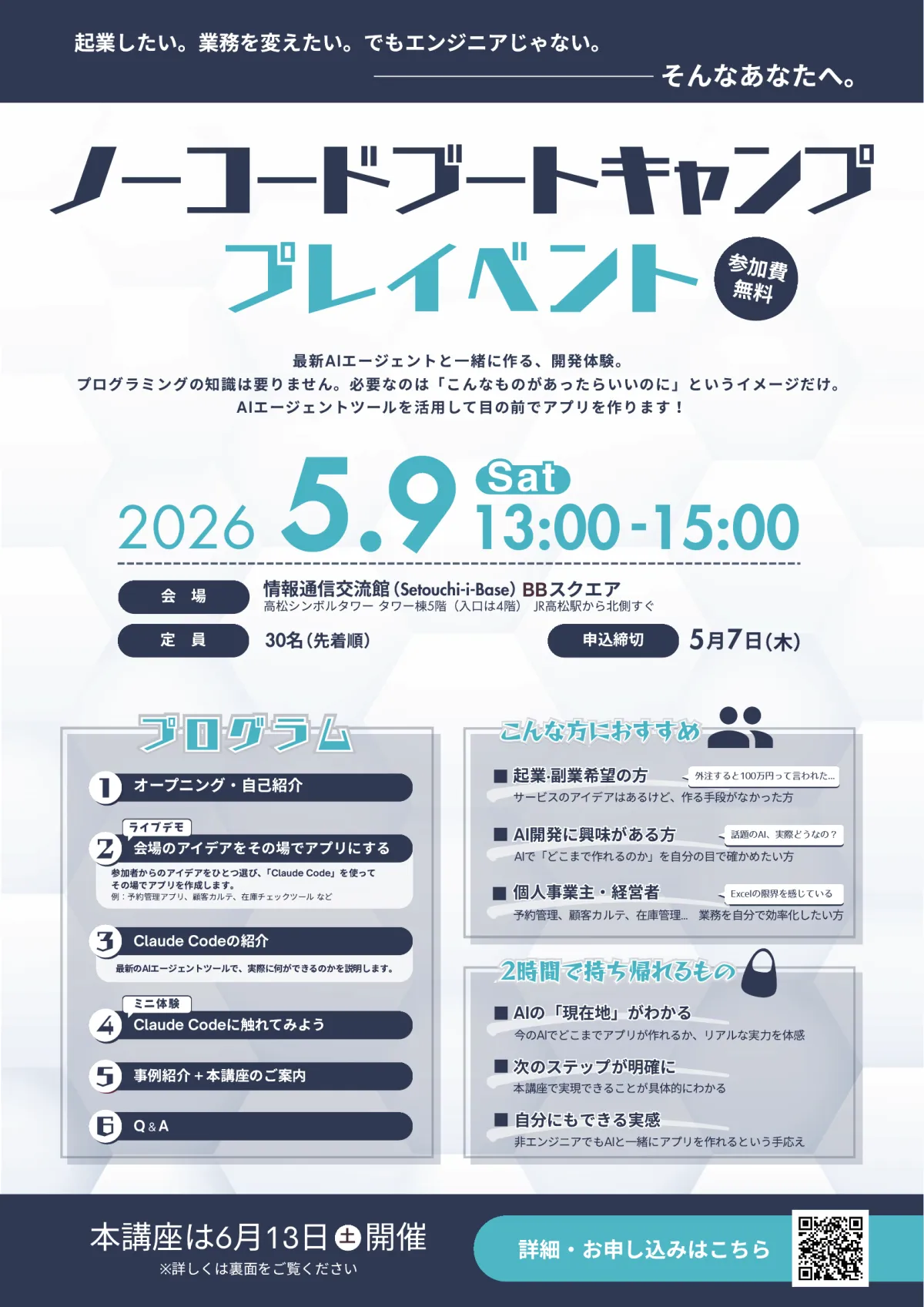 香川・高松でのこのプレイベントは、AIの力を借りて新たな一歩を踏み出すための絶好の機会です。自分のアイデアをアプリ化して、ビジネスの幅を広げるチャンスをぜひお見逃しなく!応募はお早めに!