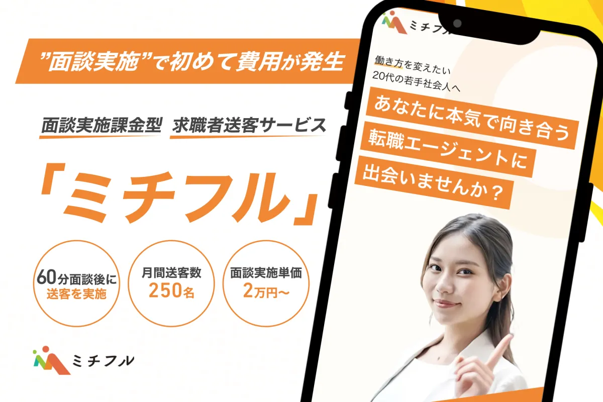 ミチフルの実績も見逃せません。月間送客数は250名を超え、年間3,000件以上の面談を生成しています。また、面談の着席率は平均83%と高い水準にあり、若年層の転職意欲の高まりを反映しています。さらに、面談実施単価は2万円スタートで、初期費用や縛りがないため、導入しやすさも大きな魅力です。