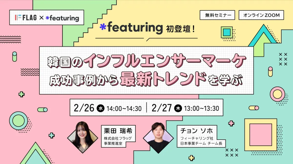 株式会社フラッグが主催する特別ウェビナーが、2025年2月26日(水)と27日(木)に開催されます。このウェビナーでは、韓国のインフルエンサーマーケティングの成功事例と最新トレンドを探ります。韓国のフィーチャリング社の協力により、特にこの分野に興味がある広告主や広告代理店のできるだけ多くの参加者が期待されています。