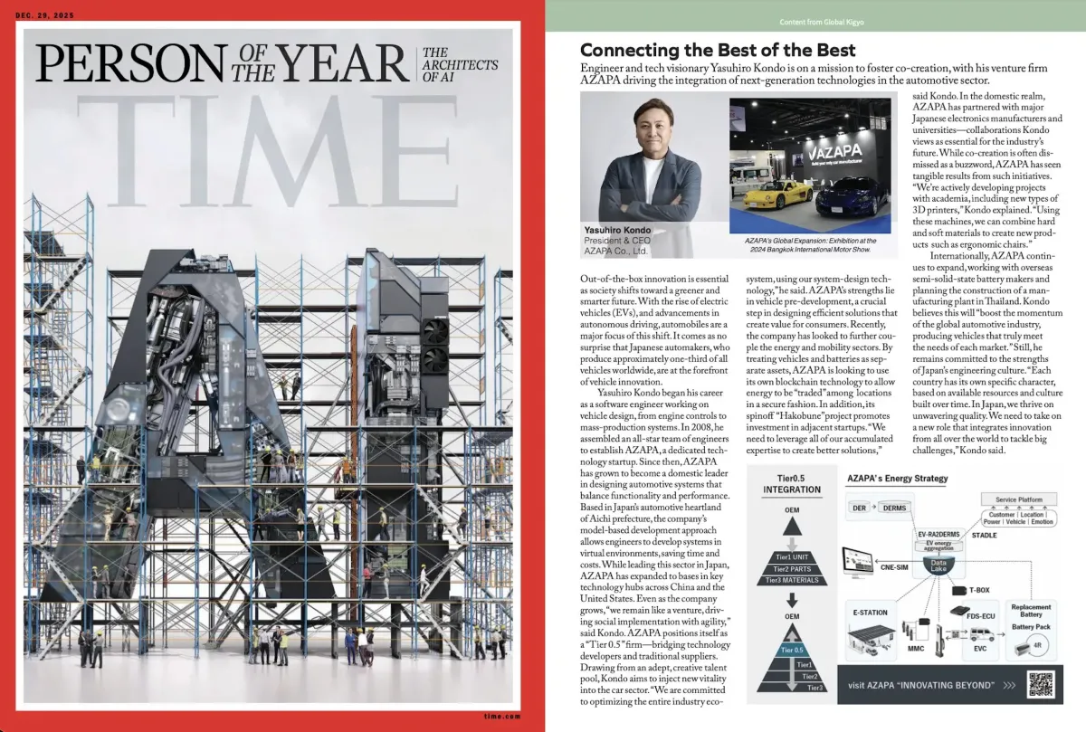 2023年12月30日発行のTIME誌アジア版に、AZAPAの代表である近藤氏のインタビューが掲載されました。近藤氏は持続可能な世界の実現に向けて革新的な思考や技術を駆使し、果敢に挑戦し続ける未来の革新者としての姿勢を示しています。