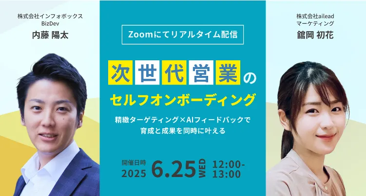 株式会社aileadと株式会社インフォボックスが共催する無料ウェビナー「次世代営業のセルフオンボーディング」が、2025年6月25日(水)に開催されます。このセミナーでは、現代の営業リーダーが抱える課題について、特に新規メンバーの育成やチーム全体の成果向上に向けた具体的な手法が紹介されます。