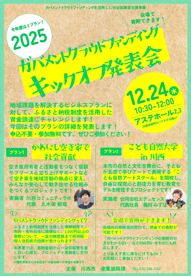 発表会と同時に、ガバメントクラウドファンディングも行います。この制度はふるさと納税を通じて寄付を募り、集まった資金はプラン実行者に支給されます。寄付を行うことで、地域に貢献しながら税控除が受けられるため、参加者にとってもメリットの多い制度です。