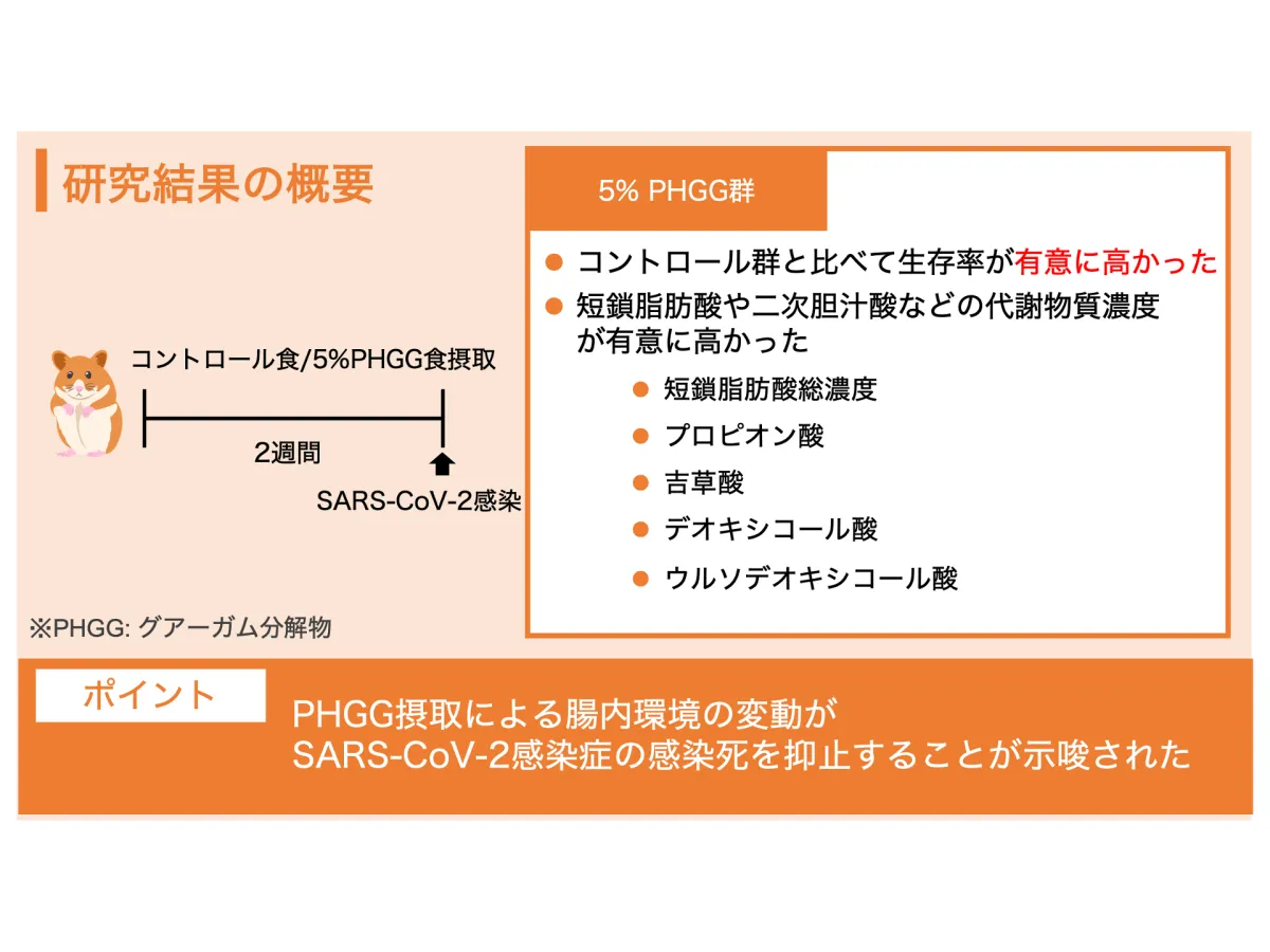 研究者は、PHGG摂取群のハムスターから得られた便を解析した結果、短鎖脂肪酸の量が有意に増加したことが確認されました。特にプロピオン酸や酪酸などは抗炎症作用が報告されており、これらの成分が新型コロナウイルス感染症の重症化を防ぐ働きを果たした可能性があります。