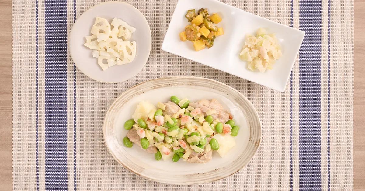 『爽やかシソベーゼのチキンポテト』の副菜も見逃せません。シャキシャキ感が魅力のレンコンサラダや、トマト風味のさっぱりしたさつまいもオクラ、さらにはシーザー味のキャベツサラダが組み合わさっています。どれも軽やかで飽きが来ない味付けで、メインディッシュの味わいを引き立ててくれる存在です。