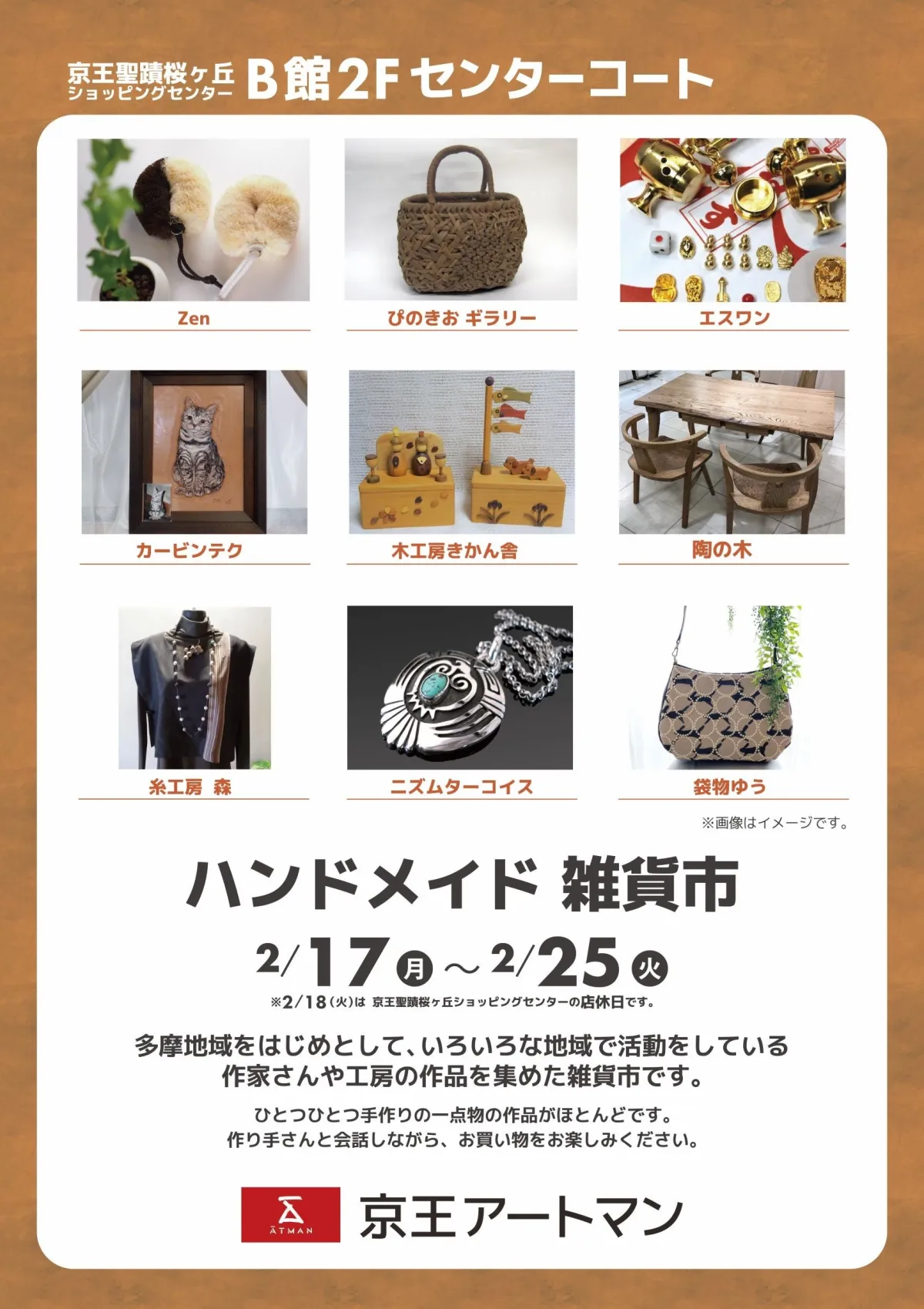 京王アートマン聖蹟桜ヶ丘店が、2025年2月17日から2月25日までの期間、京王聖蹟桜ヶ丘ショッピングセンターのB館2階センターコートにて「ハンドメイド雑貨市」を開催します。このイベントでは、多摩地域のさまざまな作家や工房の手作り作品が集まります。ひとつひとつが独自の魅力を持つ一点物のアイテムが揃っており、訪れる人々は作り手との会話を楽しみながら、お買い物をすることができます.