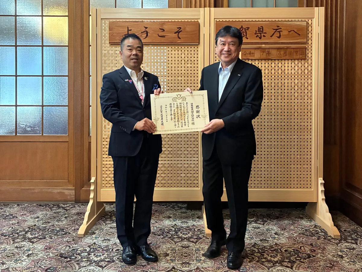 日本電気硝子株式会社は、8月19日に滋賀県庁で三日月大造知事から感謝状を授与されました。この感謝状は、同社の地域貢献活動の一環として取り組んでいる近江米の寄贈に対するもので、地域社会への貢献に対する強い姿勢を示しています。