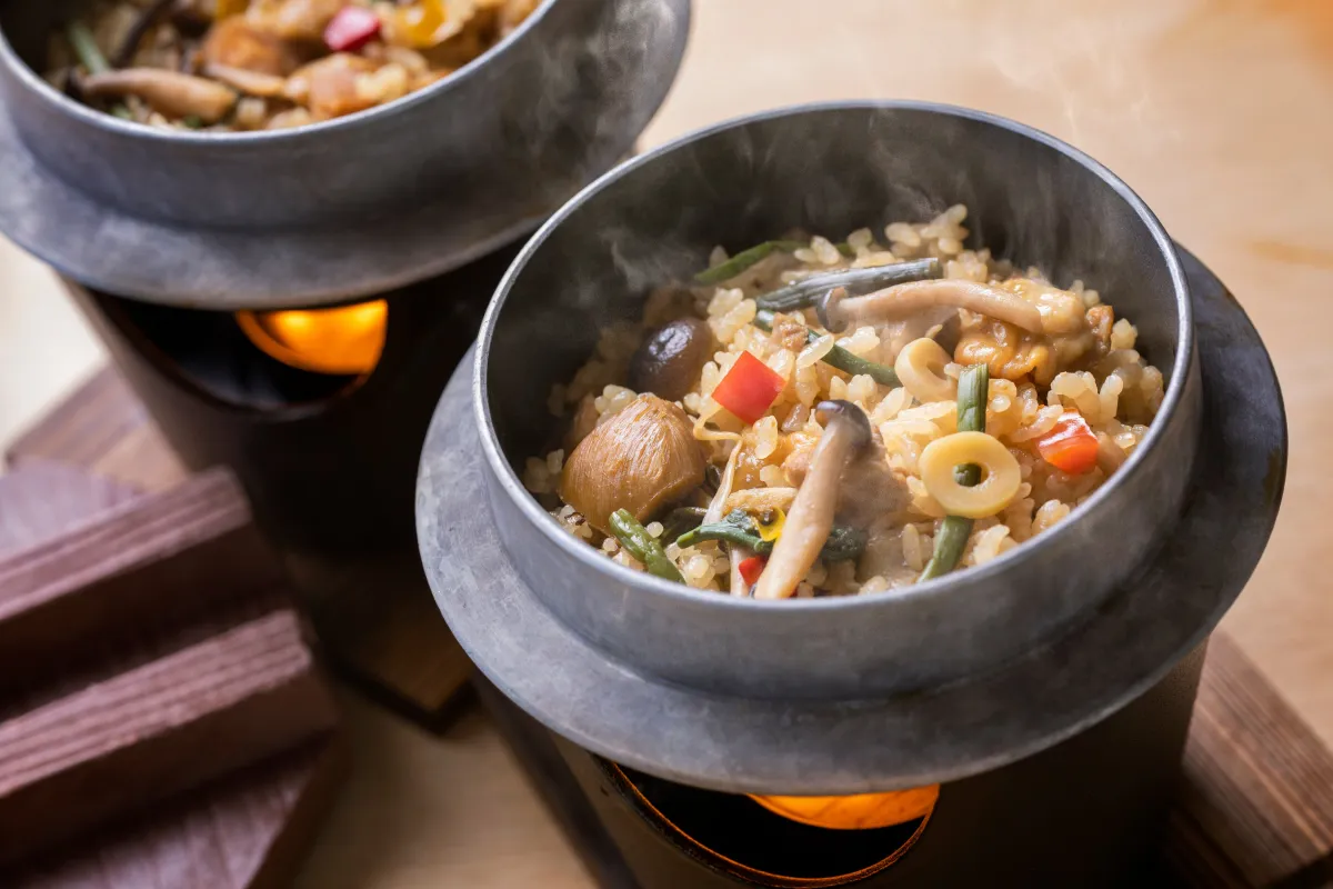 春ブッフェの目玉は、「龍神釜飯」。この料理は、特別に選ばれた「烏龍茶」を出汁に使用し、ジューシーな鶏もも肉と季節の山菜、しめじが絶妙に組み合わさっており、春の訪れを感じさせる一品です。さらに、山わさび味噌をトッピングしてお楽しみください。身体が喜ぶ新鮮な食材たちが、味覚を存分に満たしてくれます。