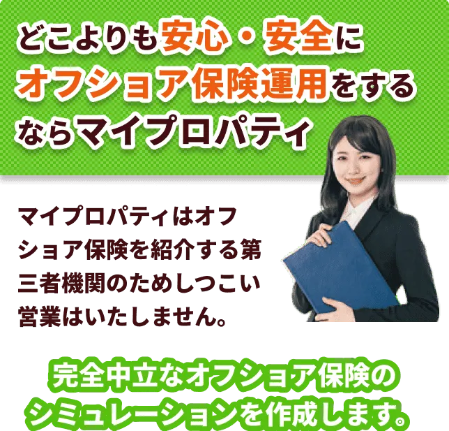 海外生命保険のマイプロパティは、年利回り10%を超えるオフショア貯蓄型生命保険を新たにスタートしました。この商品は、資産の安定した増加を期待する方に特におすすめです。今後も、海外の優良商品を紹介しながら、日本人のオフショア投資をサポートしていくことをお約束します。
