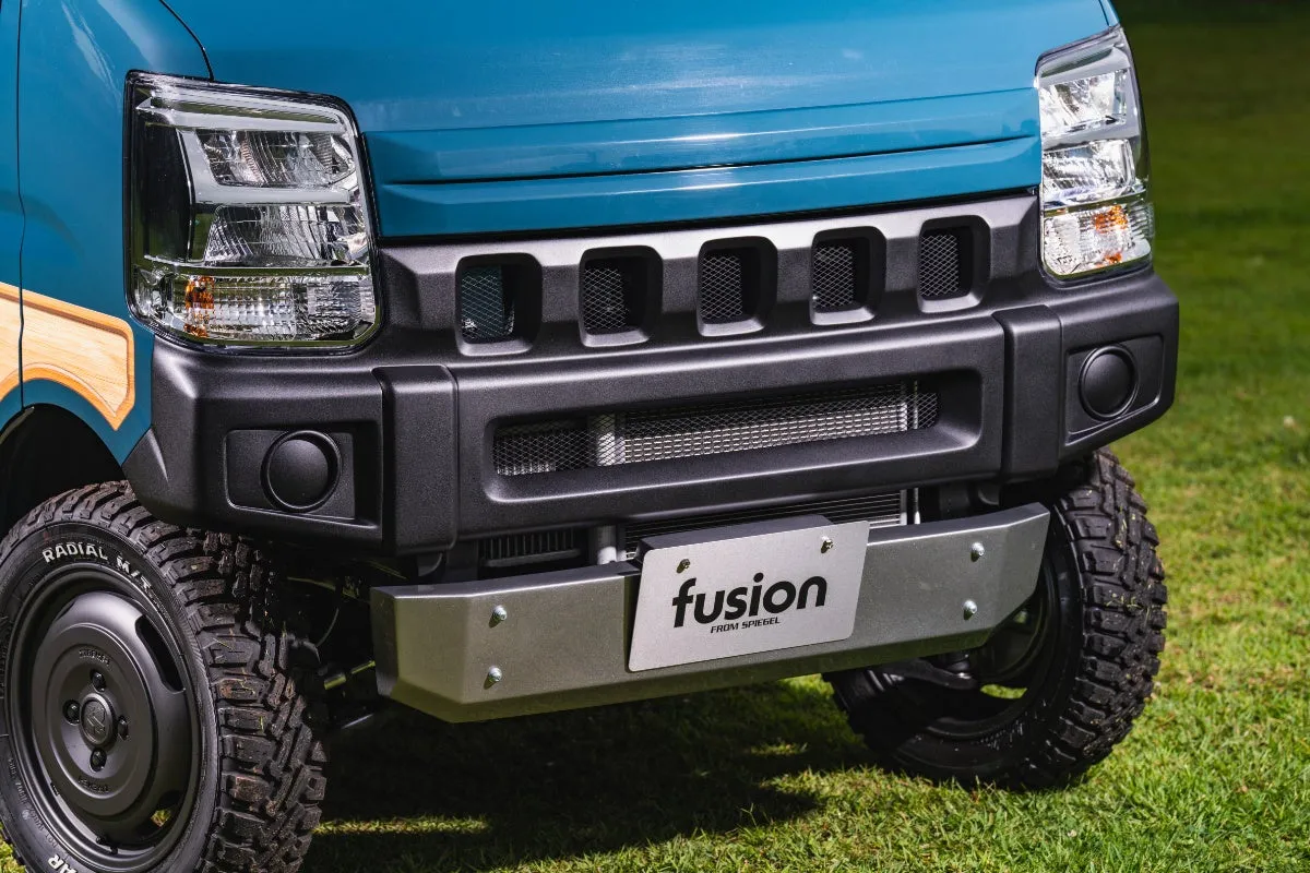 デザインも非常に洗練されており、フォグランプなしの状態でも違和感のない仕上がりです。シンプルでスタイリッシュなフォルムは、エブリイのフロントマスクとの一体感を生み出し、おしゃれな印象を与えます。また、ボトムを大幅に切り上げたフロントバンパーは、リフトアップした足元をしっかりと主張できるデザインになっています。この部分はシボブラックで塗装されており、エクステリアに統一感を持たせています。