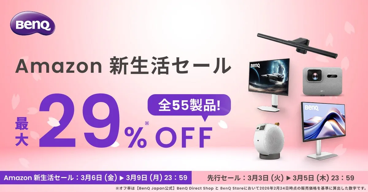 おうち時間をより快適に、そして贅沢に過ごすためのセールがやってきます。ベンキュージャパン株式会社が、Amazonで開催される「新生活セール」にて、選りすぐりのモニターやプロジェクターを最大29%オフで販売することが発表されました。対象商品には、Mac向けモニターや人気のゲーミングモニター、便利な天井モバイルプロジェクターがラインナップされています。開催期間は3月3日(火)0:00から3月9日(月)23:59までで、多数の製品が特別価格で用意されています。