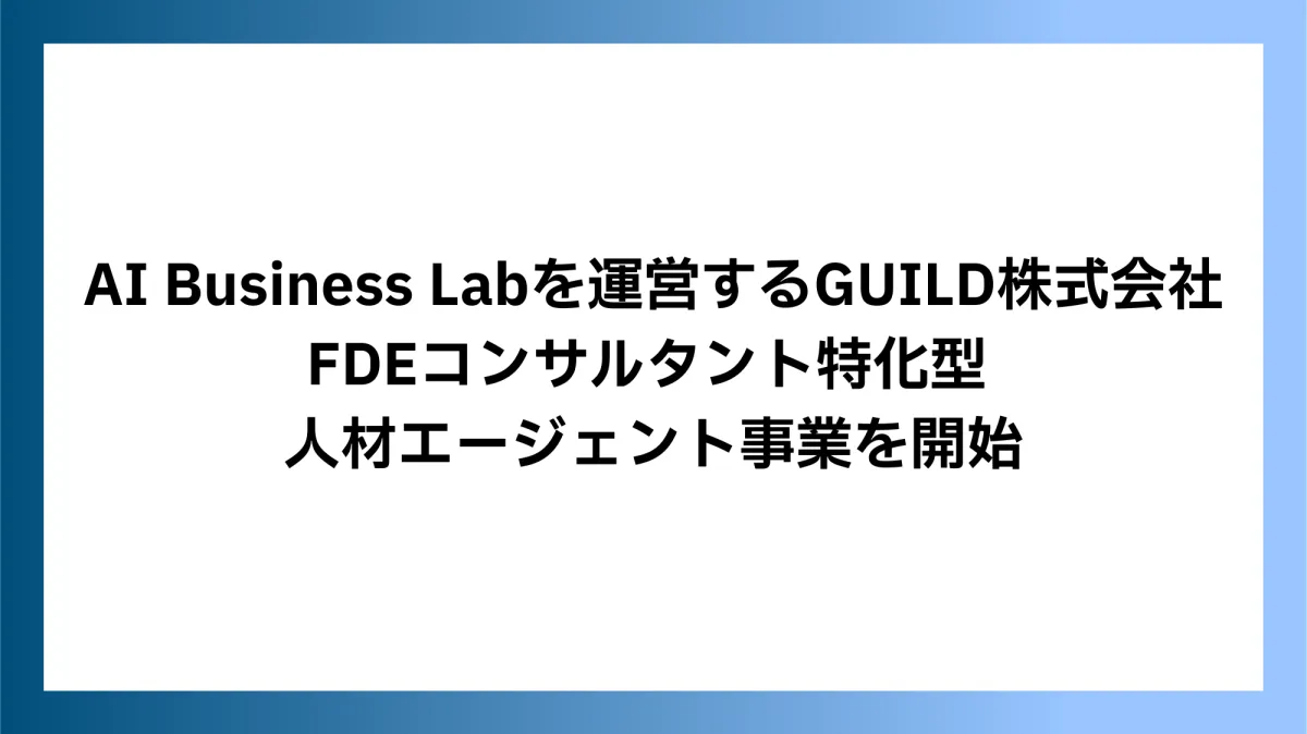 GUILD株式会社は、AI Business Labを運営し、東京都渋谷区神宮前に本社を構えています。この度、同社はFDE(フォワードデプロイドエンジニア)コンサルタント特化型の人材エージェント事業を立ち上げたことを発表しました。