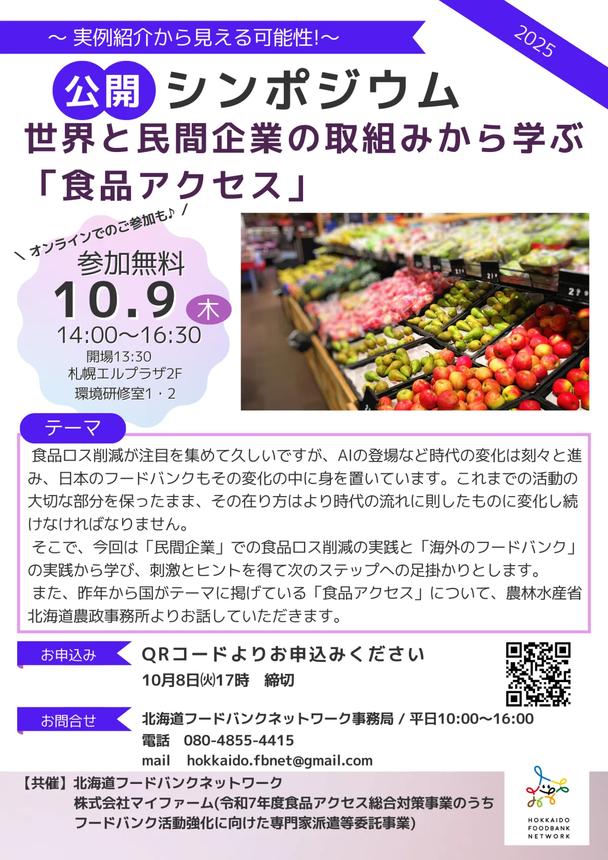 2023年10月9日(木)、札幌エルプラザにて、「食品アクセス」をテーマにした公開シンポジウムが開催されます。このイベントでは、国が提唱する「食品アクセス」の意味やその重要性に焦点を当て、食べ物にアクセスできない人々に効率的に食を届ける方法について探ります。